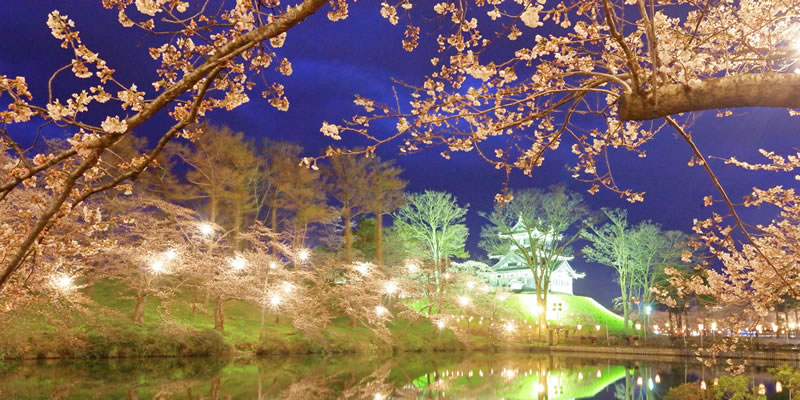 - ライトアップされた高田城三重櫓と桜が映える内堀